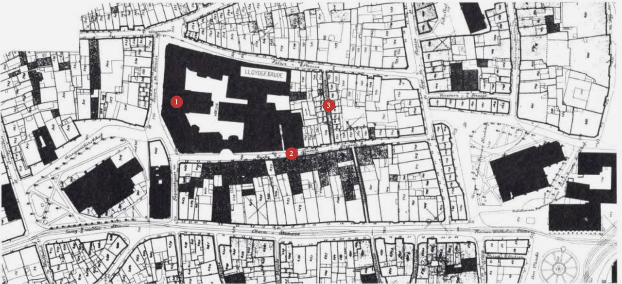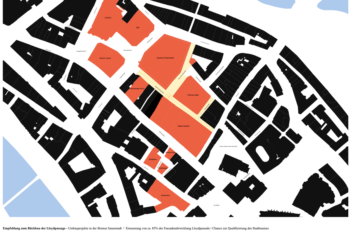Oben links rot umrandet der riesige Kaufhof-Klotz, rechts daneben in orange das Parkhaus Mitte. Ebenfalls im Visier hatte Zech damals das Karstadt-Sporthaus nochmal rechts in gelb (mittlerweile ebenfalls Leerstand). Südlich der quer durch das Bild laufenden Lloydpassage befindet sich das denkmalgeschützte Karstadtgebäude (lila) mit einem hier grün umrandeten, sehr hässlichen Anbau, der abgerissen werden sollte.
