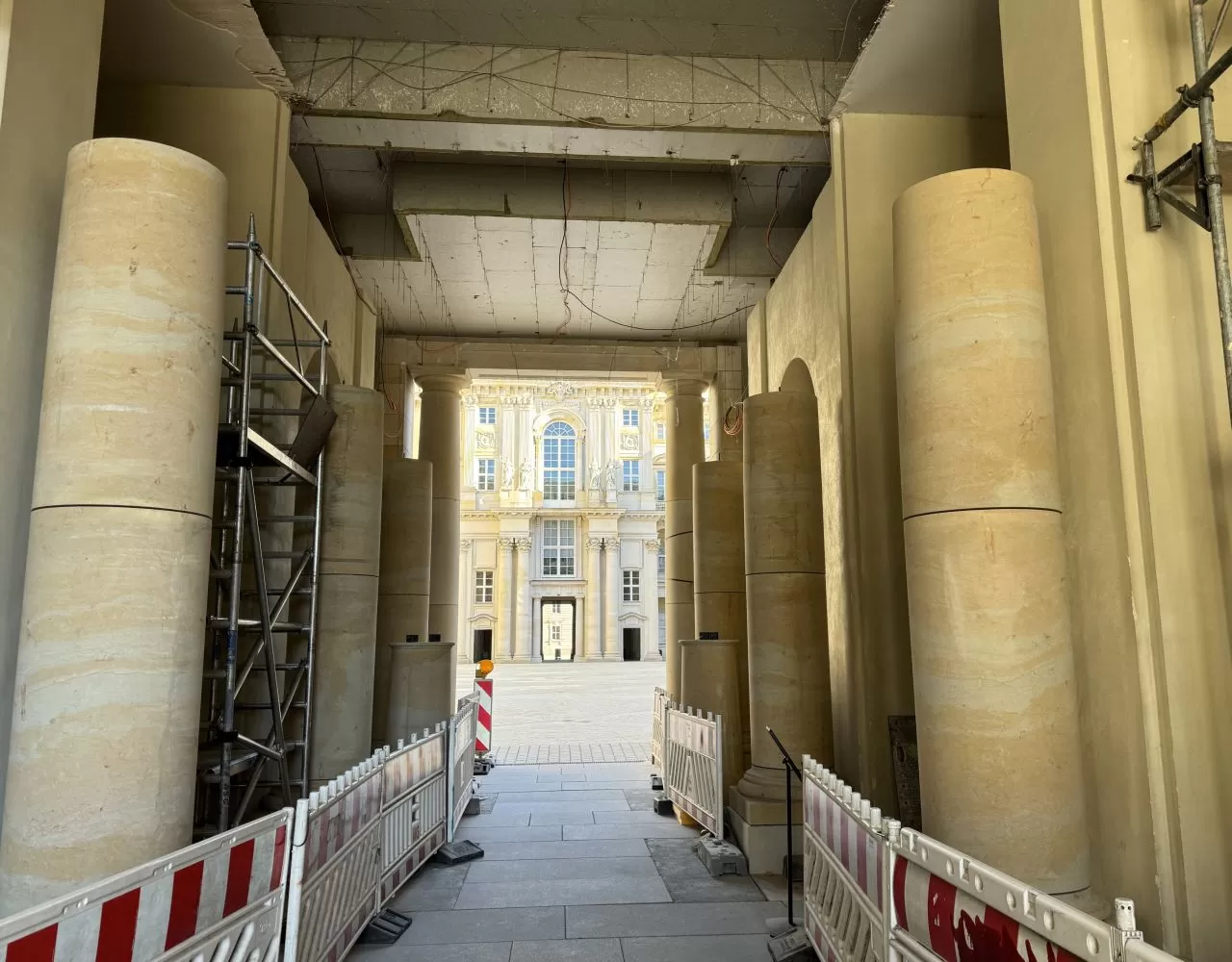 Endlich werden die Säulenkorridore errichtet, so dass wenigstens im EG nachvollziehbar wird, wie sehr die Fassadenarchitektur den Schlosskörper durchzog.